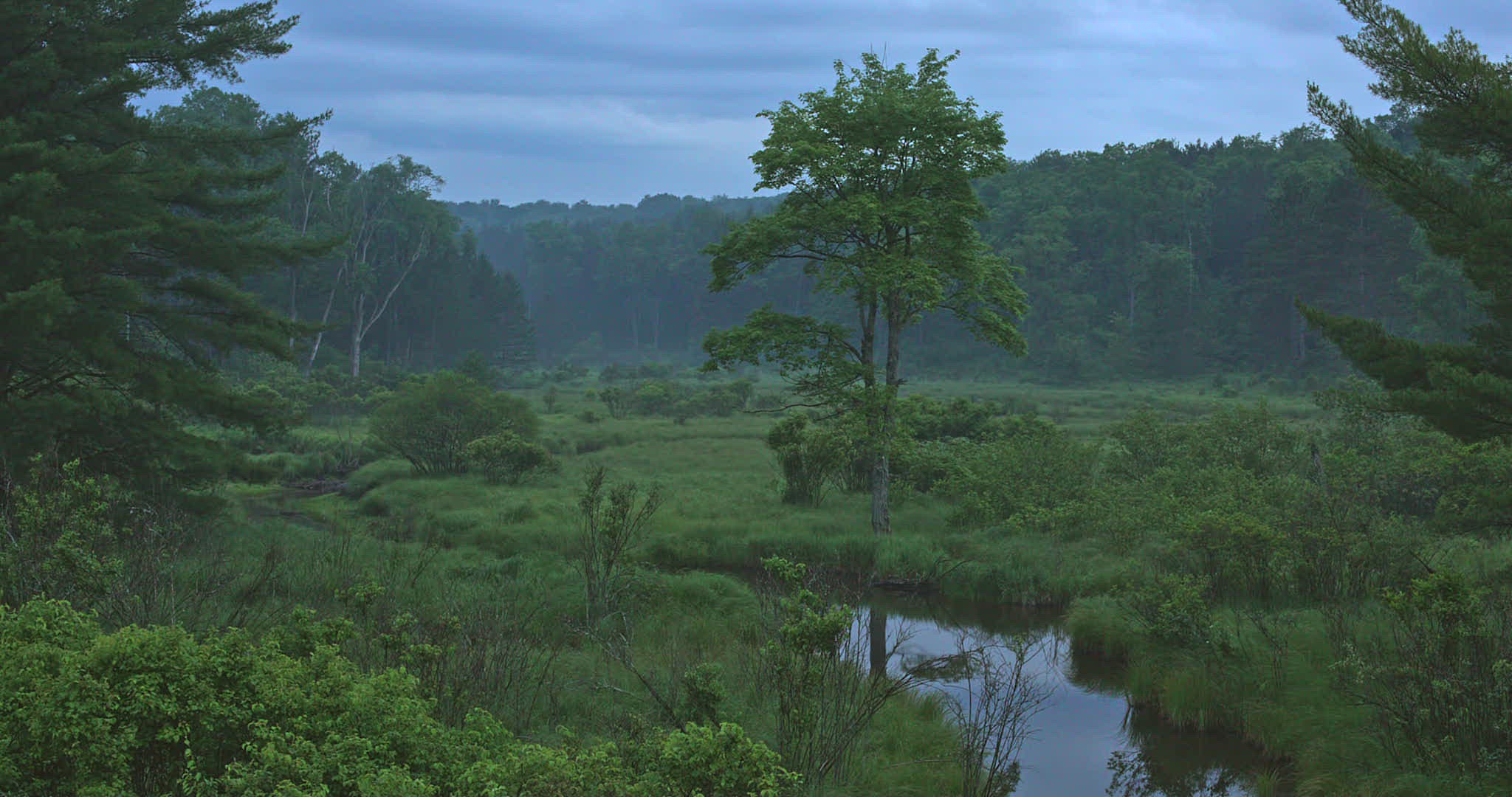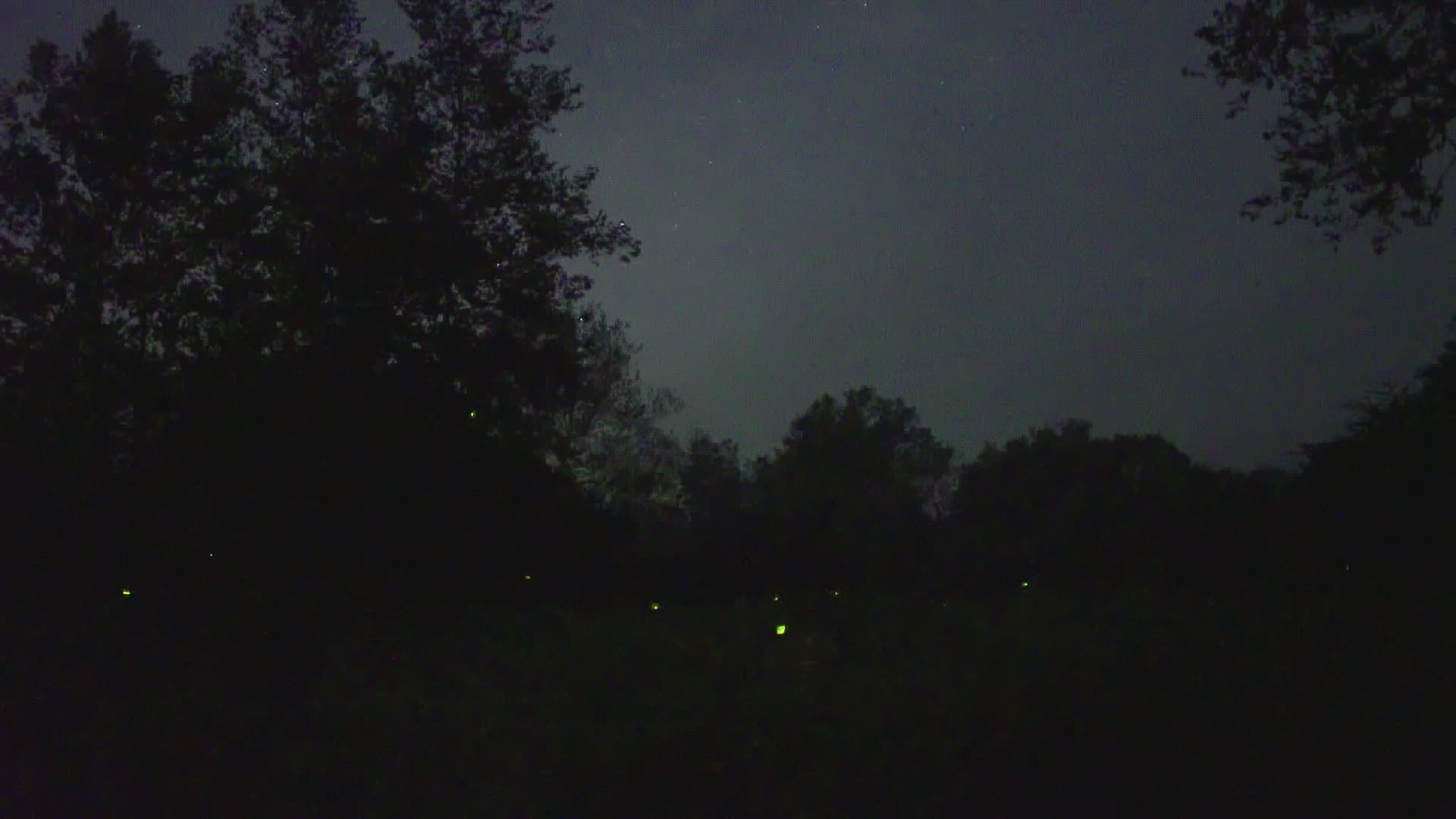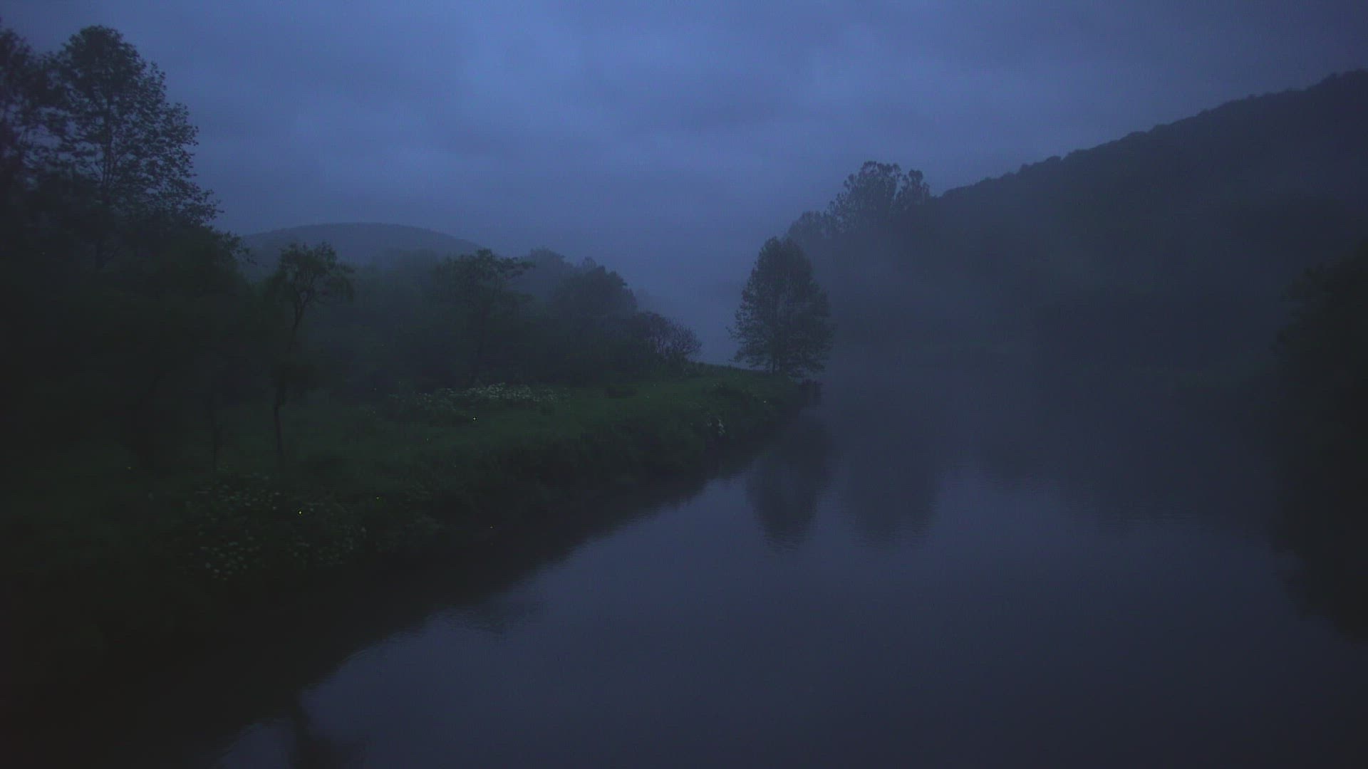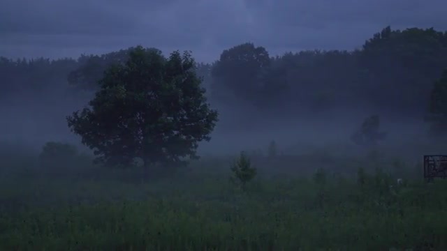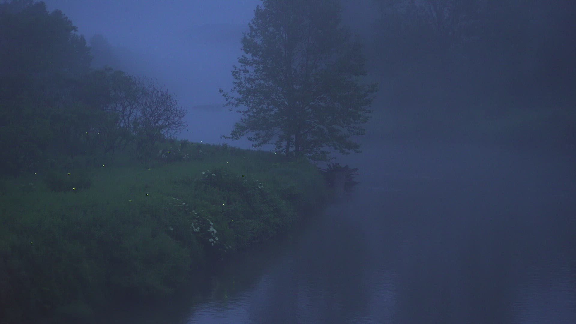 Panning long shot over foggy prairie with fireflies