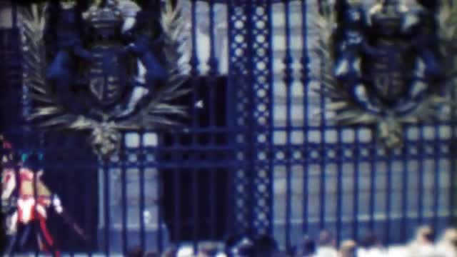 > 1963: Bearskin Royal British Queen Guards protected behind fenced gates. LONDON, ENGLAND