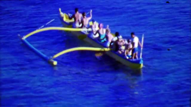 > 1964: Hawaiian outrigger style boat paddling in bold blue waters. HONOLULU, HAWAII
