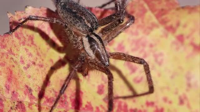 > Macro shot of a brown striped spider.