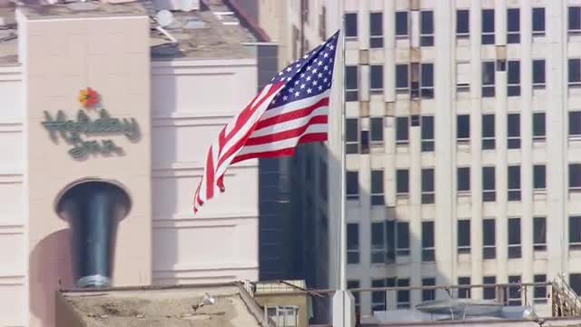 > Panning left shot of the Texas School Book Depository at Dealey Plaza, Dallas.