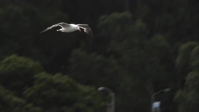 > Shot following a seagul flying out over the water.