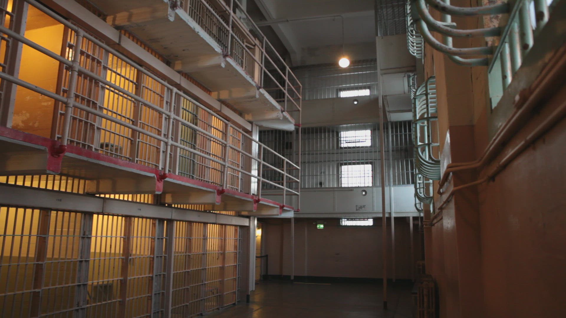 560712 - Panning shot from Alcatraz Island to Golden Gate Bridge to San Francisco to the Oakland Bay Bridge.