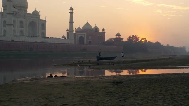 561711 - Taj Mahal, boat ,and reflection of sunset