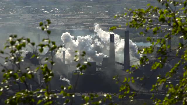 > Air Pollution From the Plant. Smoke and Pipes Through the Green Branches of a Tree.