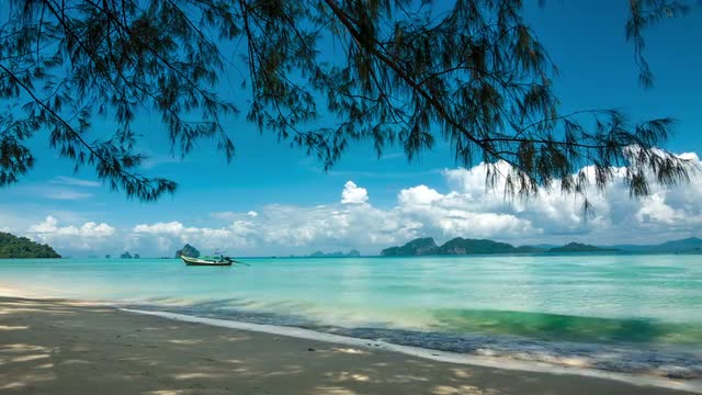 Fishing boat in a turquoise sea near sand shore with fooliage and bungalows