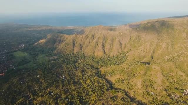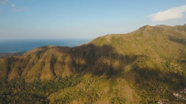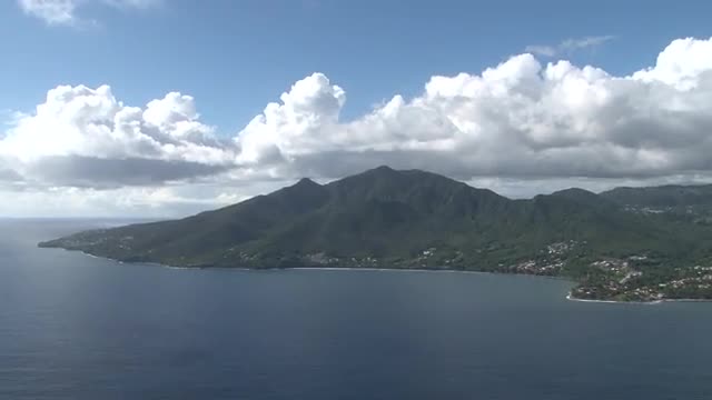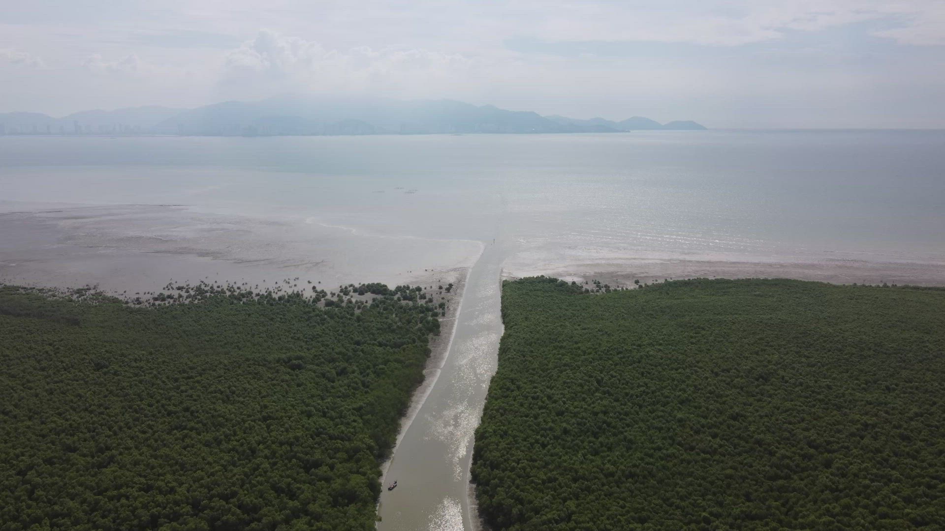 Seascape with forest island and clouds flying in camera time lapse