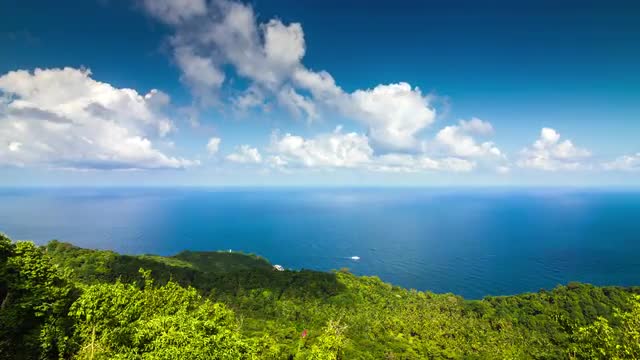 Seascape with forest island and clouds flying right to left time lapse