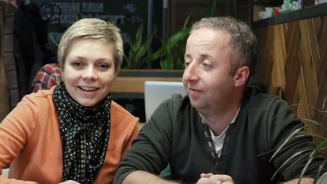 Couple greets and waves to a friend by video chat while sitting in a cafe restaurant. Modern communication technology scene. 4K UHD video footage.