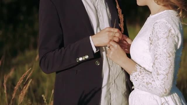 Beauty Couple Relaxing on Wheat Field Together. Groom in Burgundy Jacket. the Bride in a White Lace Dress. Pine Trees in the Background.