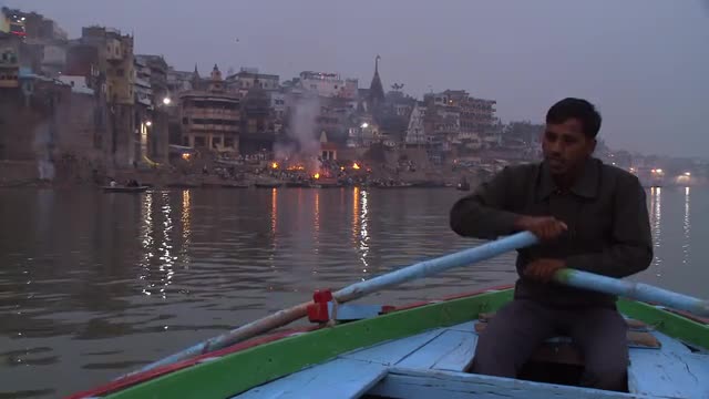 > Medium tight shot of man rowing a boat on the foggy Ganges river in India.