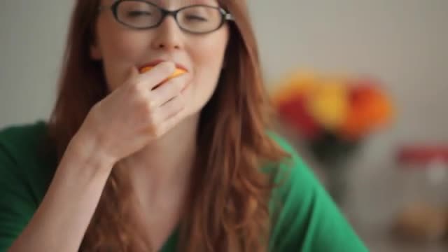 An extreme close up of a woman dipping a strawberry into chocolate and eating it.