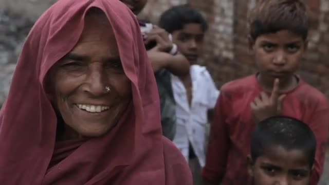 691960 - MS Senior woman wearing red sari, children in background / India