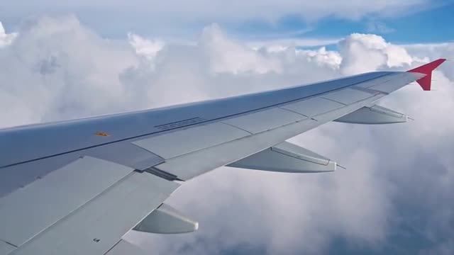 Flying Plane on a Background of Clouds. Shot Through a Porthole. we Can See the Wing of the Aircraft and the White Cirrus Clouds