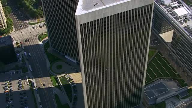 4K quality timelapse of midday clouds moving behind the top of a tall city building (Renaissance Tower) in Sacramento, CA.