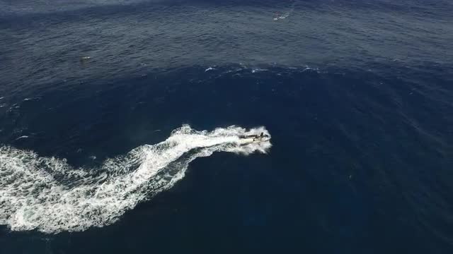 A rescue jet ski drives around Jaws. Filmed from a drone in 4k.
