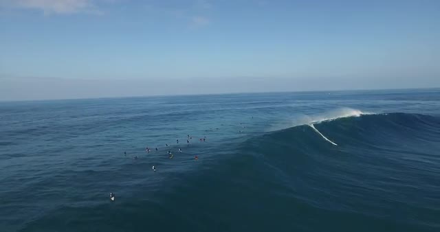 A surfer surfs giant waves at Pe'ahi in Maui Hawaii. Shot from a drone in 4k.
