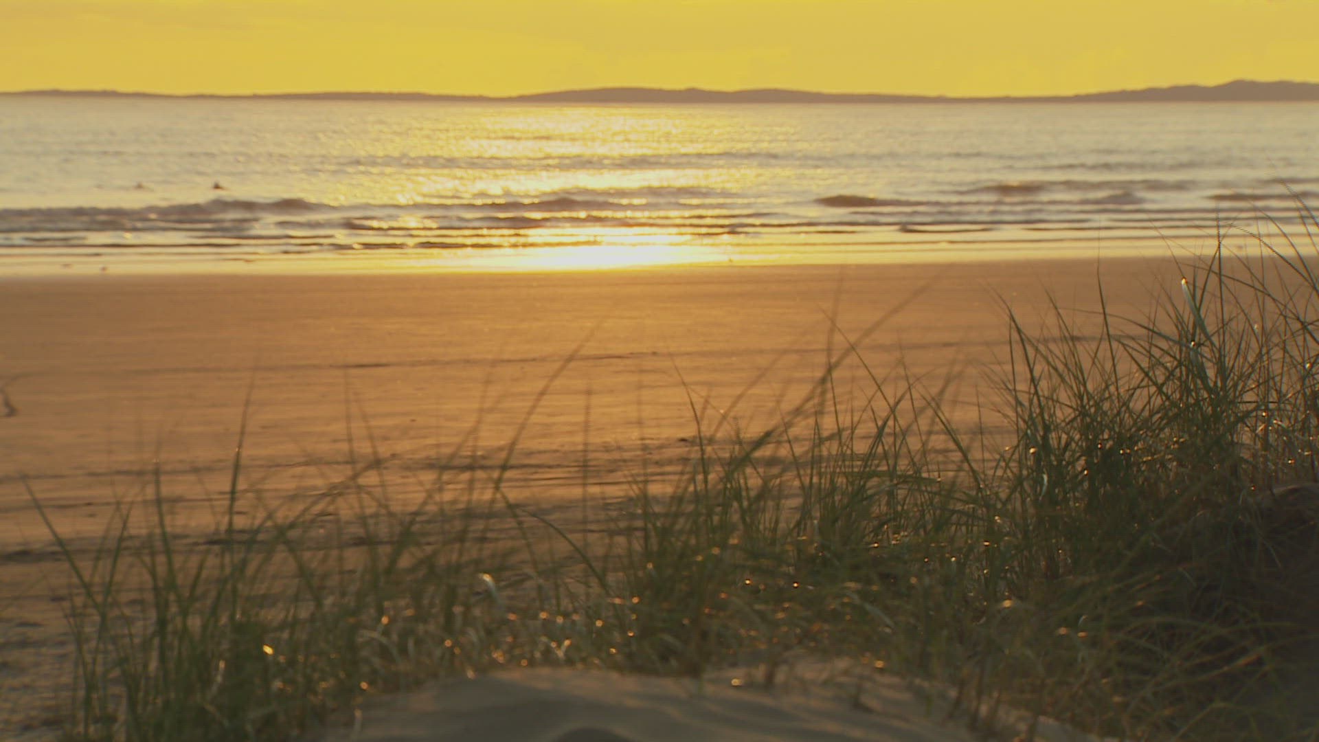 People moving around on beach at sunset in Kings Beach at Lake Tahoe, CA.