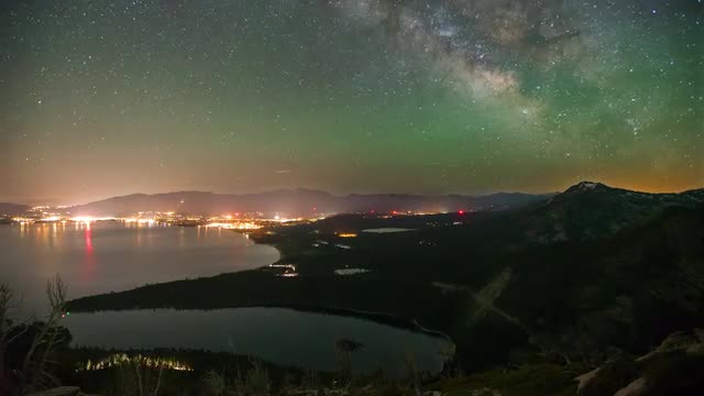 Timelapse of the Milky Way passing behind a dead tree in Lake Tahoe.