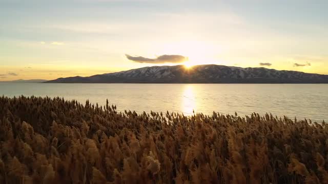 1050033 - Flying over golden reeds at the edge of Utah Lake