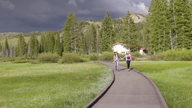 Teenage Girls Walk Along Nature Boardwalk Toward Camera, Storm Clouds In Background