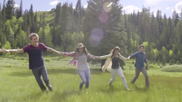 > Group Of Teens Hold Hands, Spin In A Giant Circle, Through Mountain Meadow (Slow Motion)