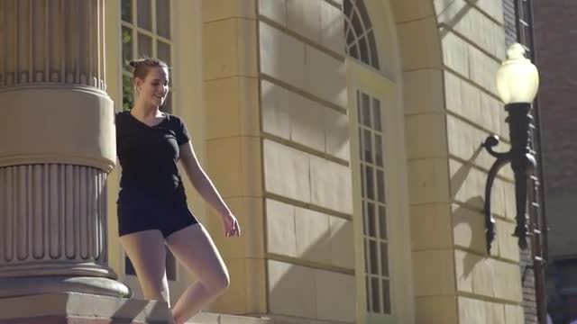 > Smiling Ballerina Holds Onto Column, She Practices Leg Extension Twice (Slow Motion)
