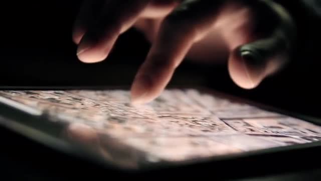 Browsing city map on tablet PC in the dark. Man's hand and screen close-up. (av5572c)