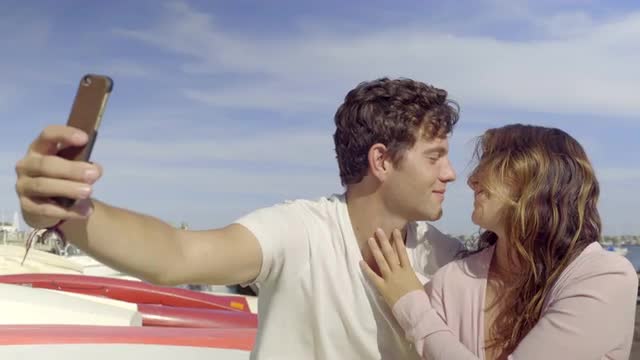> Attractive Couple Relax On Beach In Harbor, They Chat And Laugh