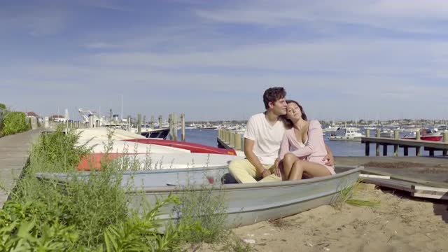 Attractive Couple Relax On Beach In Harbor, They Chat And Laugh