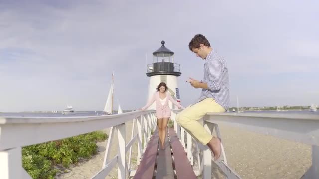 567636 - Young Woman Poses For Photos In Front Of Lighthouse, Sailboat Goes By In Background, Her Boyfriend S