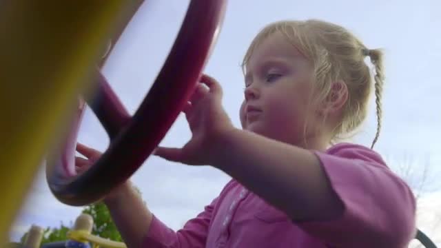 > Happy Little Girl Rolls Down A Hill In Park (Slow Motion)