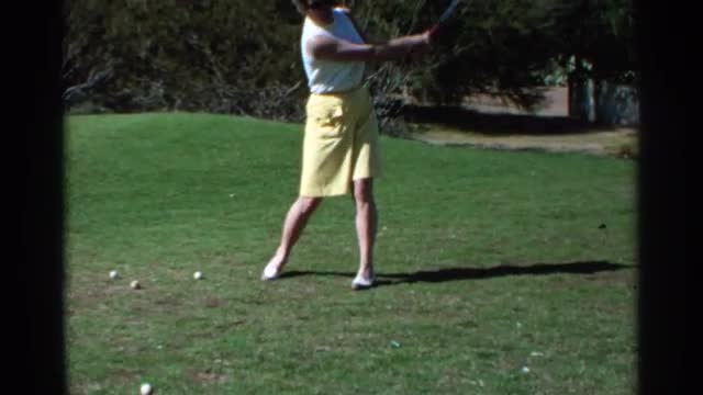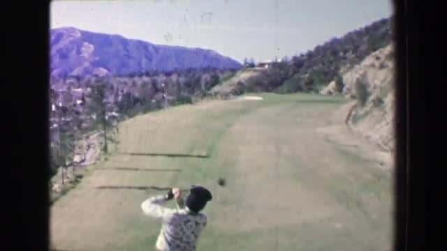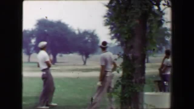 > 1968: Golfers tee off with iron club on par 3 hole as sweetheart girl watches.