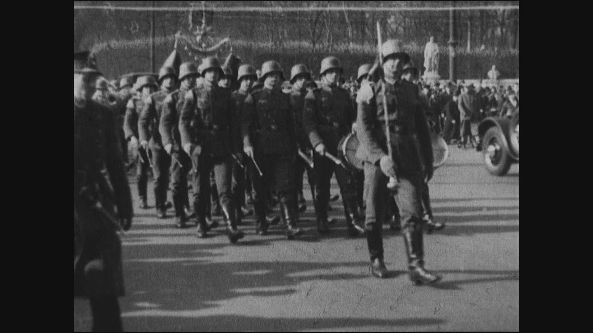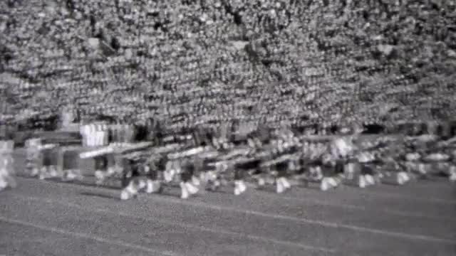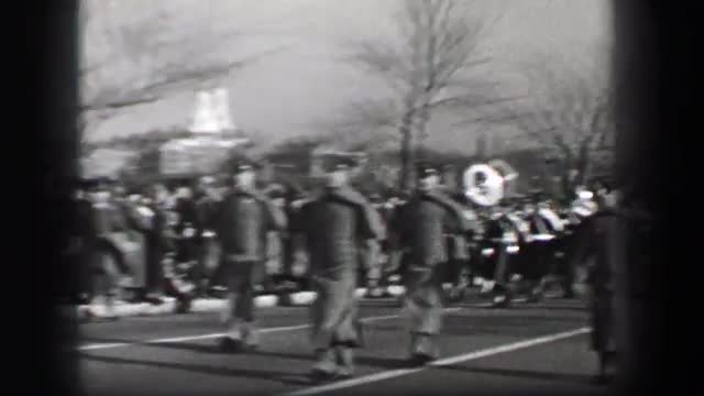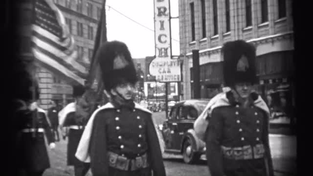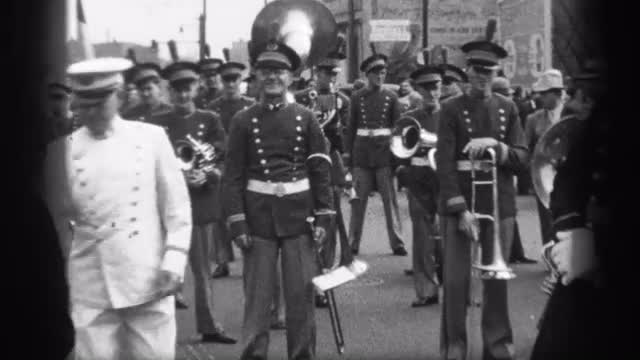 > 1937: Marching band military parade downtown city crowd watching from sidelines. NEW YORK CITY