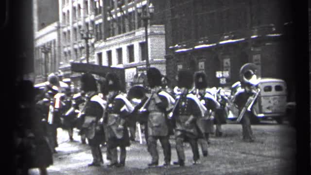 1937: Marching band military parade downtown city crowd watching from sidelines. NEW YORK CITY