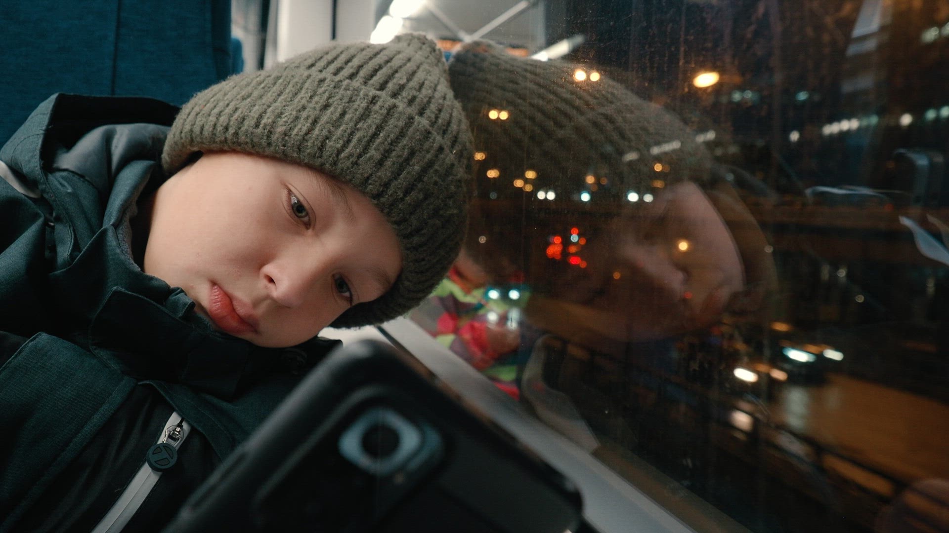 Slow motion shot of a happy smiling teenage boy looking in open window from the house