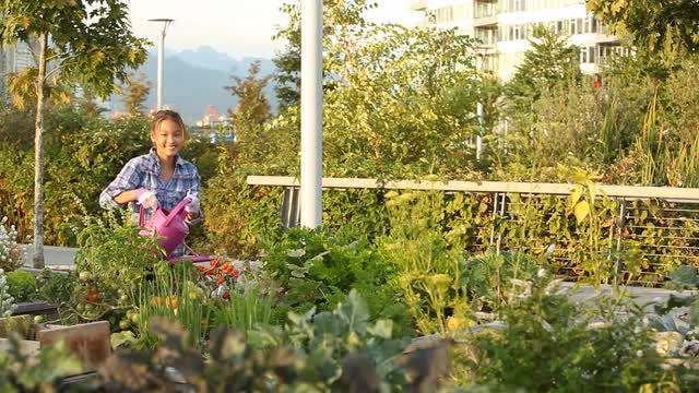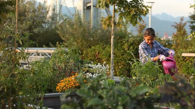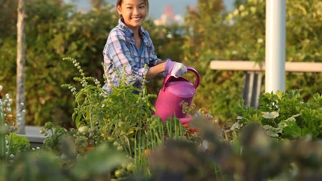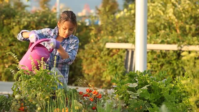 Slow motion shot of a teenager girl holding watering can and watering flowers in open window