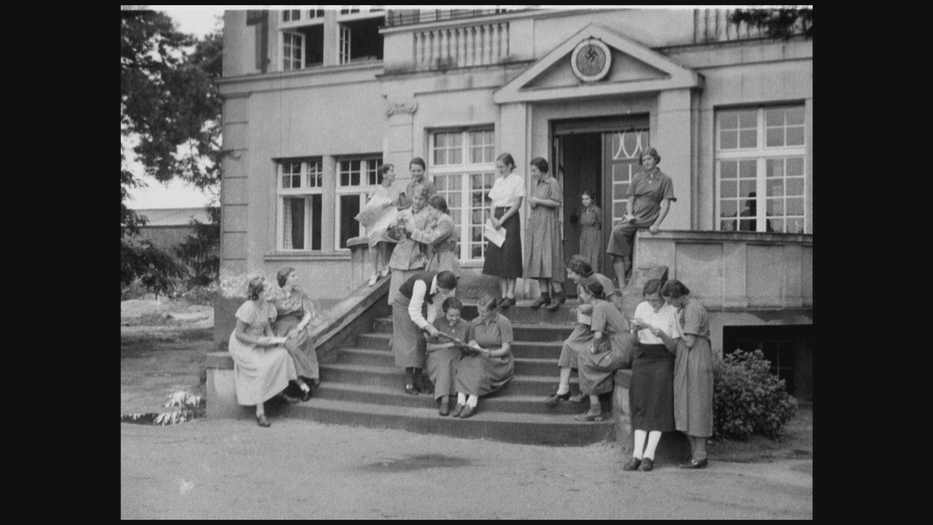 > 1939: Young girls sitting front porch stoop with wavy curly long bangs hair style. ATHENS, GEORGIA