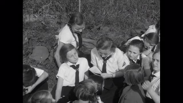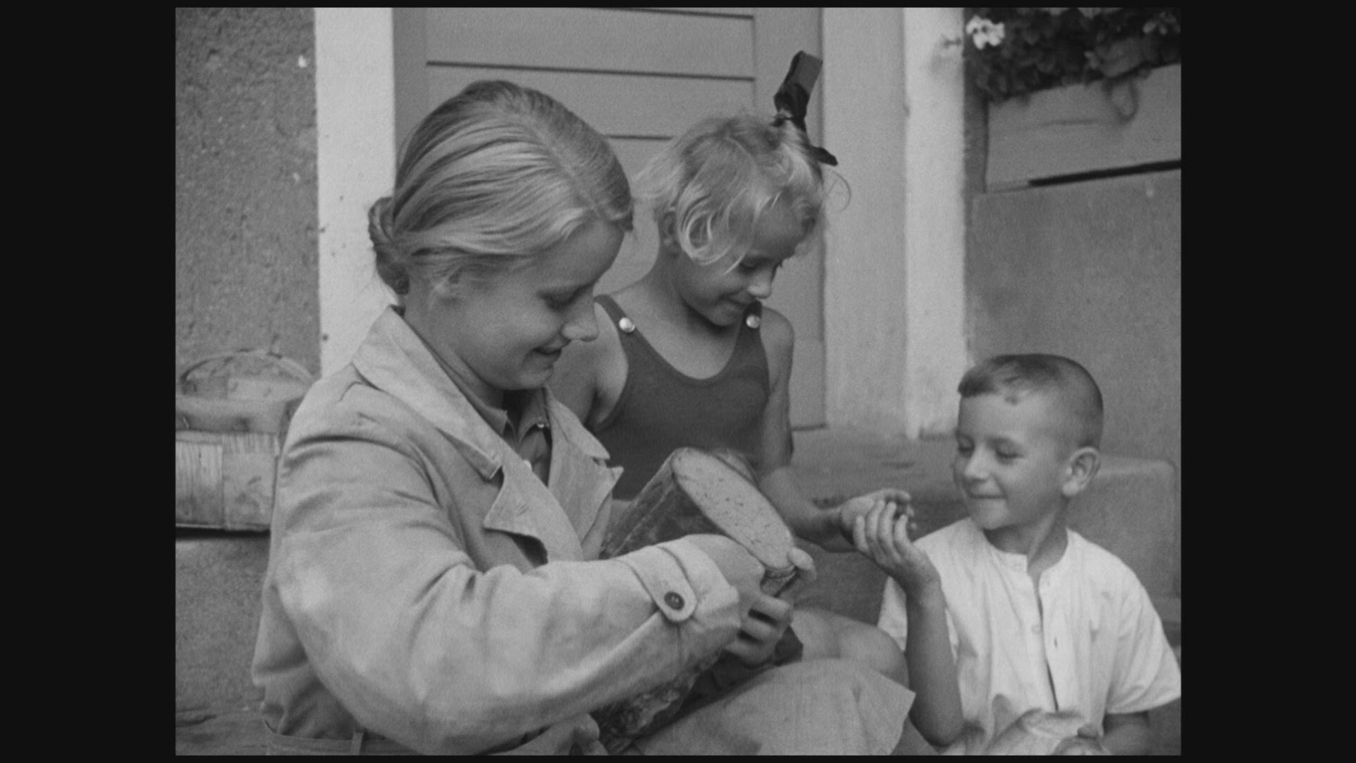 > 1939: Young girls race over to sit on front porch stoop with wavy curly long bangs hair style. ATH