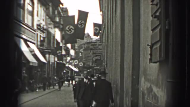 > 1937: Nazi banner flags hang on downtown building streets. BERLIN, GERMANY