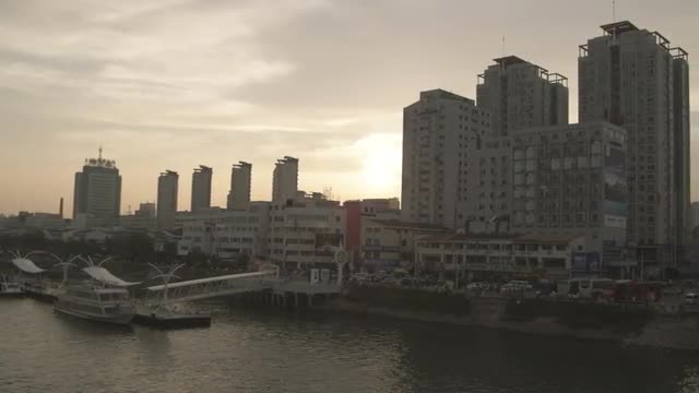 Panning shot of a Chinese city skyline from a bridge.