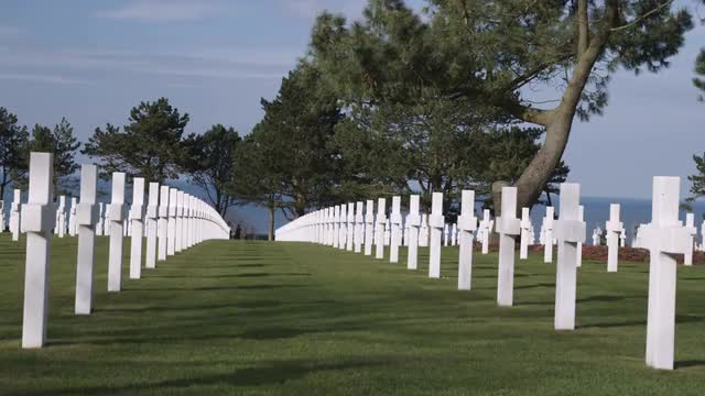 Serene shot of the American military cemetery in Normandy France. The ocean seen in the background.