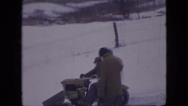 Old vintage 1960 Dodge truck driving down snowy road in the mountain in the aspen trees