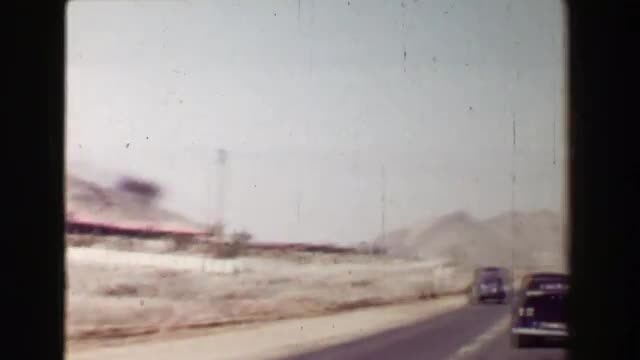 > 1968: Driving in southwestern USA dry desert landscape passing classic 1940s car.