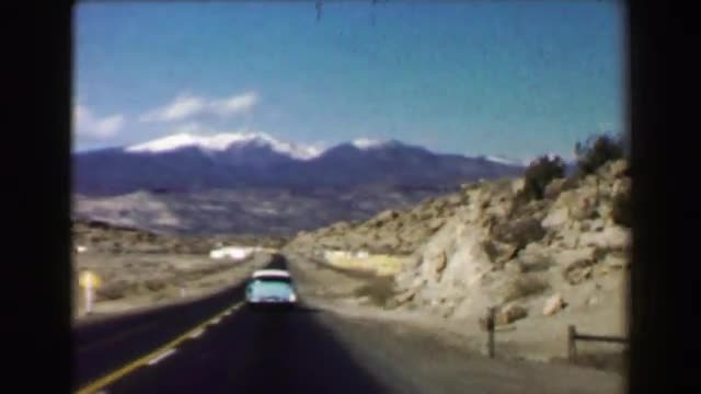 > 1968: Car driving across open space mountainous mirage dry lake ahead.