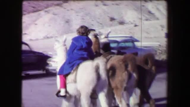 > 1968: Old miner giving girl llama ride around western USA tourist attraction.