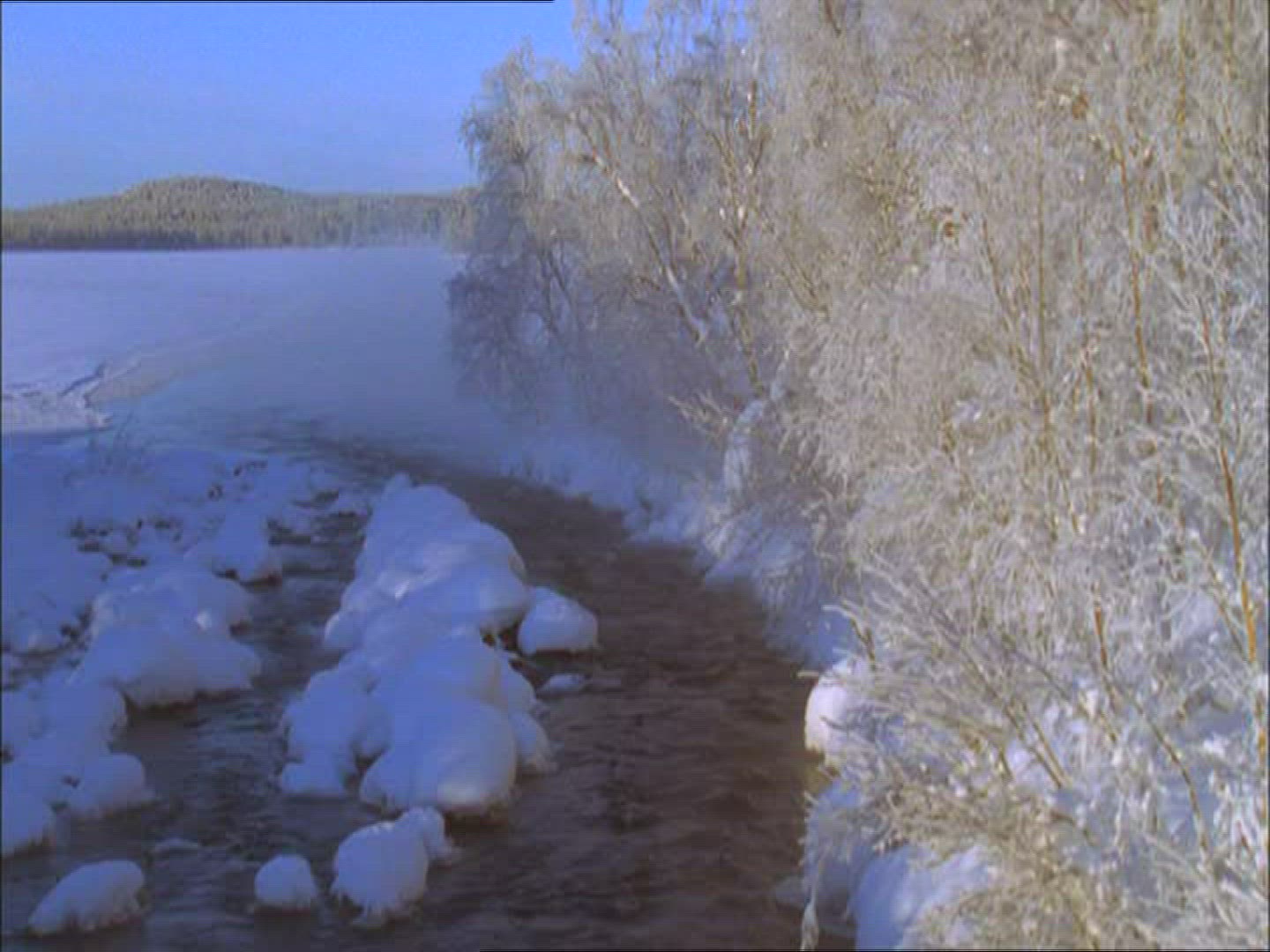 River streaming slowly in Nordic winter landscape with snowy surroundings.