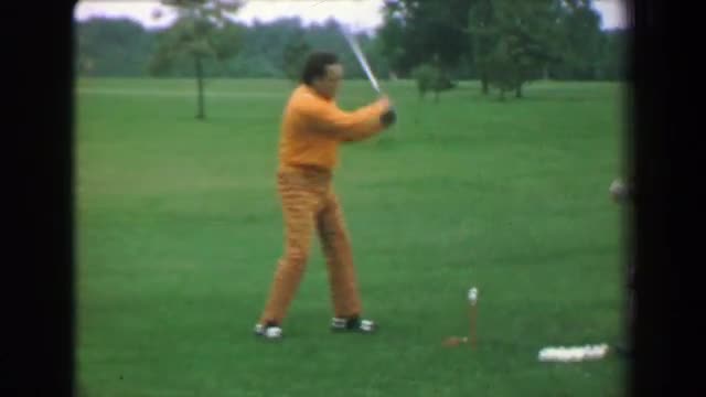> 1969: Golfing trick shot professional performance man hitting balls on tall tees.