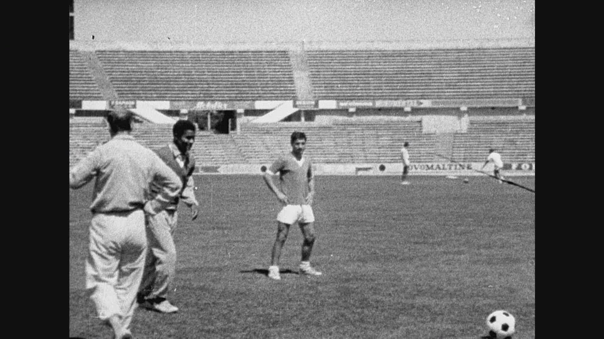 > 1969: Golfing trick shot professional performance man one handed wedge strike.