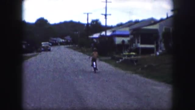 > 1958: Girl riding tricycle bike on residential sidewalk on sunny winter day.
